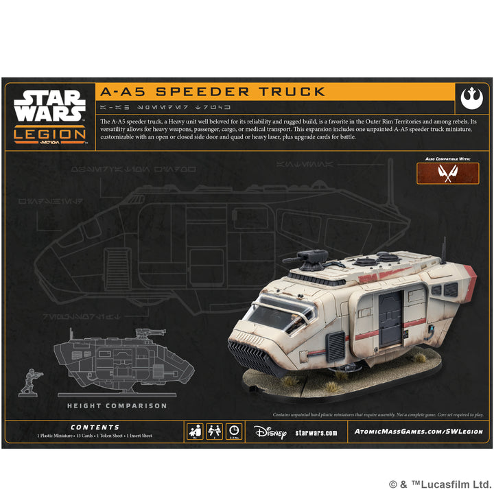 The A-A5 Speeder Truck provides Star WarsTM: Legion players with a robust and versatile heavy transport. Rebel players will find that this vehicle greatly improves the mobility of their troops across the battlefield while also being able to provide covering fire with its mounted weapons. Additionally, its strong armor plating can provide cover for rebel troops during intense blaster fights.